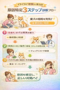 まずは、STEP1の病気の可能性をクリアにすることが最優先です。この記事のチェックリストを参考に、少しでも気になる点があれば、かかりつけの獣医師さんにご相談ください。